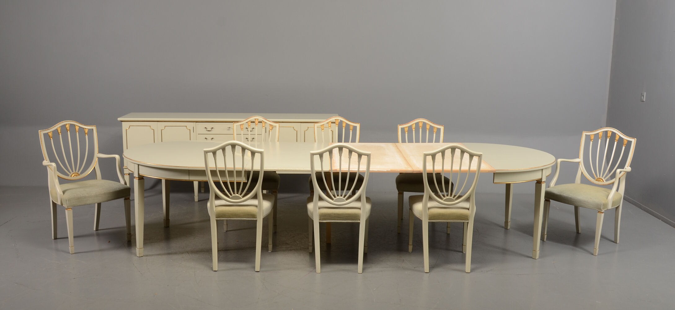 Stort spisestue bestående av 12 stoler bord med 4 ileggsplater og skjenk. Fantstisk flott og elegant gustaviansk spisestue fra epok. Ellers i god stand. Bordet leveres med 2 ileggsplater på 50 cm hver slik at det kan forlenges opp til 275 cm.